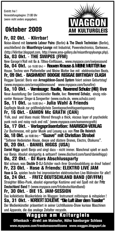 Beitrags-Kategorie:AllgemeinHurra – das frische Oktober-Programm ist da. das pdf folgt! Wir sehen uns im Waggon! Weitere Artikel ansehen Vorheriger Beitrag03.10.2009 – The Swipes Nächster Beitrag04.10.2009 – Meine Mutter LiveSchreibe einen Kommentar Antworten abbrechenKommentierenGib deinen Namen oder Benutzernamen zum Kommentieren einGib deine E-Mail-Adresse zum Kommentieren einGib deine Website-URL ein (optional) Meinen Namen, meine E-Mail-Adresse und meine Website in diesem Browser für die nächste Kommentierung speichern. ΔDiese Website verwendet Akismet, um Spam zu reduzieren. Erfahre, wie deine Kommentardaten verarbeitet werden.