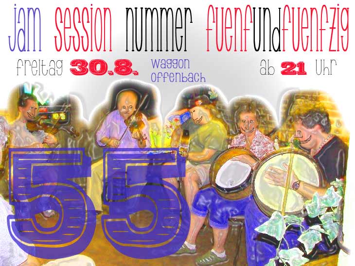 Beitrags-Kategorie:ProgrammFreitag, 30. August 2013 (ab 21 Uhr) – Jam Session #55 Die nächste Jam Session im Waggon. Kollektivimprovisationen zwischen Folk, Rock, Jazz und Wahnsinn! Du und dein Instrument, ihr könnt dabei sein!Weitere Artikel ansehen Vorheriger BeitragDonnerstag, 29.8.2013 – Filmabend Nächster BeitragSamstag, 31.8.2013 – Steffen Willems‘ Clubwagen #1Schreibe einen Kommentar Antworten abbrechenKommentierenGib deinen Namen oder Benutzernamen zum Kommentieren einGib deine E-Mail-Adresse zum Kommentieren einGib deine Website-URL ein (optional) Meinen Namen, meine E-Mail-Adresse und meine Website in diesem Browser für die nächste Kommentierung speichern. ΔDiese Website verwendet Akismet, um Spam zu reduzieren. Erfahre, wie deine Kommentardaten verarbeitet werden.