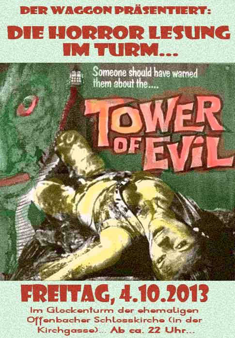 Treffpunkt ist aber der Waggon (ab 21 Uhr), von wo aus wir dann gemeinsam zum Turm des Grauens schleichen werden ( – ist um die Ecke!). Vorher und danach wird uns der Baron mit thematisch passender Musik im Waggon erfreuen! Kommt vorbei, neugierige und durstige Menschlein!