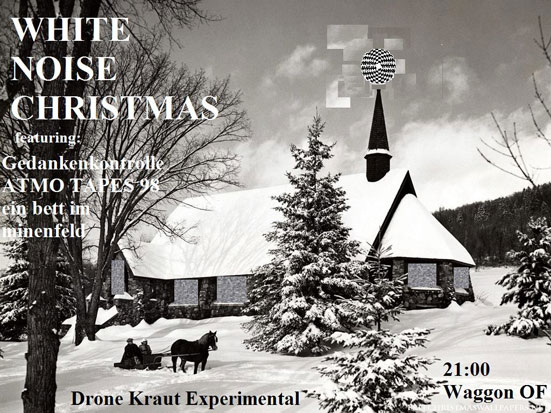 Die traditionelle Waggon-Weihnachtsfeier (seit 2009!) Live: DRONE EXPERIMENTAL KRAUT mit GEDANKENKONTROLLE (FFM) und ATMO TAPES 98 (OF). Free Gifts for all visitors! Das festliche Rahmenprogramm besorgt wieder das Ein Bett Im Minenfeld DJ-Team mit Industrial, Minimal, Military Pop, Power Electronics, Neofolk, Metal, Techno, Elektro, 80’s, 90’s , 20er Schlager und SpongeBob. White Noise Christmas 1+3+1+2+2+0+1+3=?