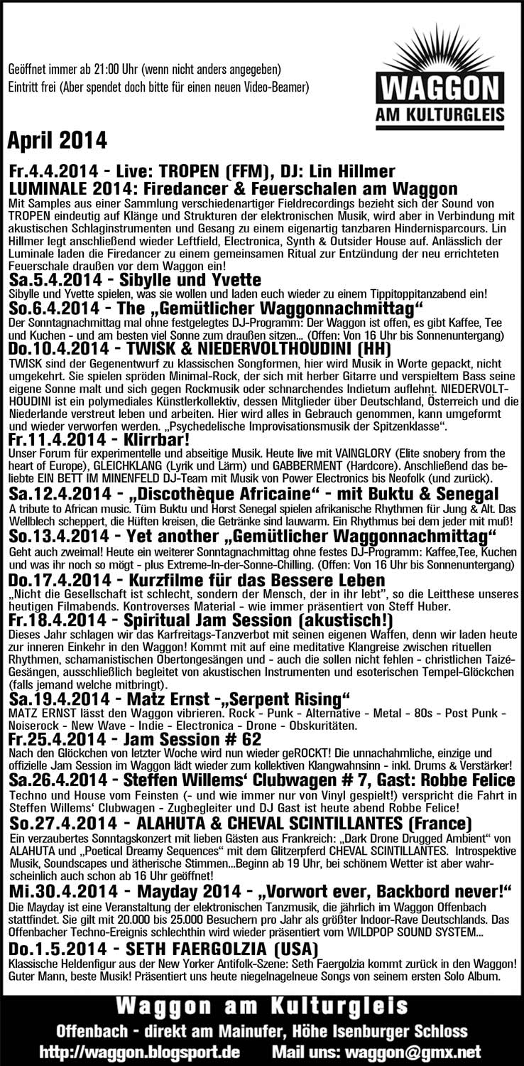 April, April! Selbstverständlich ist der pünktlich zum Monatsanfang erschienene neue Programm-Flyer, den ihr unten seht (und mit dem Befehl „Grafik speichern unter“ auf eure Festplatte bannen könnt) nur ein schlechter April-Scherz, denn in Wahrheit findet bei uns ja den ganzen April über das vierwöchige „Hessische Volksmusik Festival 2014“ statt. Einen ganzen Monat lang jeden Abend – und als täglicher Höhepunkt ein Auftritt des Offenbacher Waidmanns Chors. Uffta-Uffta – alle antreten zum Schunkeln, dasisteinbefehl! Wir freun uns auf euren Besuch!