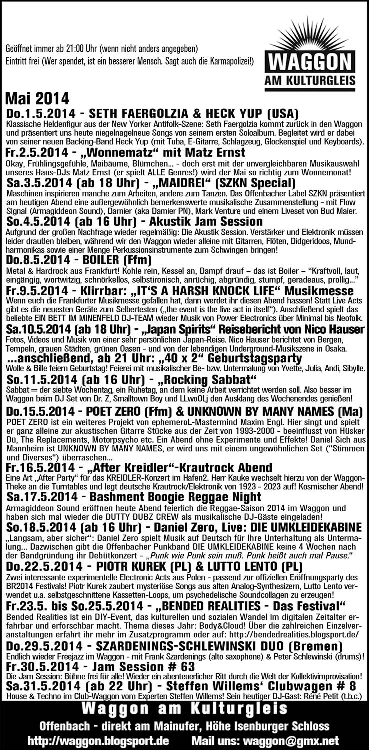 Ihr seht also: Zahlreiche Gründe, dem Waggon im Mai zahlreiche Besuche abzustatten! Wir freun uns jedesmal aufs Neue auf Euch!