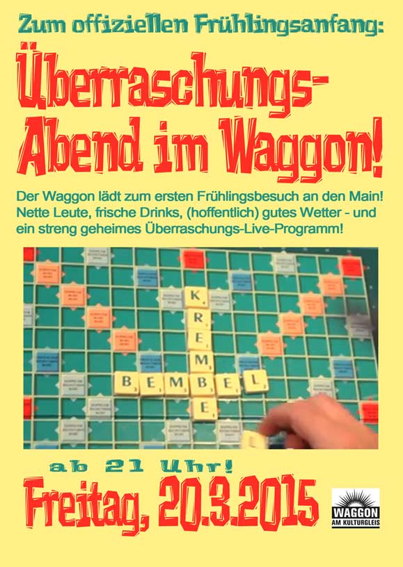 Zum offiziellen Frühlingsanfang gibt es heute einen Überraschungs-Abend im Waggon! Nette Leute, frische Drinks, (hoffentlich) gutes Wetter – und ein prima Live-Act, der sehr gut in diese Stimmung passt – aber natürlich STRENG GEHEIM BLEIBT, weil wo bliebe sonst die Überraschung? Selbst vorbeikommen und staunen, lachen und feiern! Ist ja jetzt immerhin Frühling!