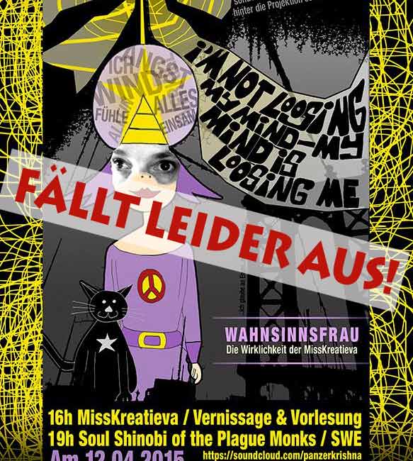ACHTUNG! Wer es noch nicht mitbekommen hat: Die ursprünglich für Sonntag 12.4.2015 angekündigte Vernissage/Lesung von MISS KREATIEVA (und das anschließende KONZERT) muß krankheitsbedingt leider ausfallen… Deshalb KEINE Veranstaltung am Sonntag im Waggon! Wir wünschen gute Beserung und baldige Genesung (um dann die Veranstaltung/Ausstellung nachzuholen…) !