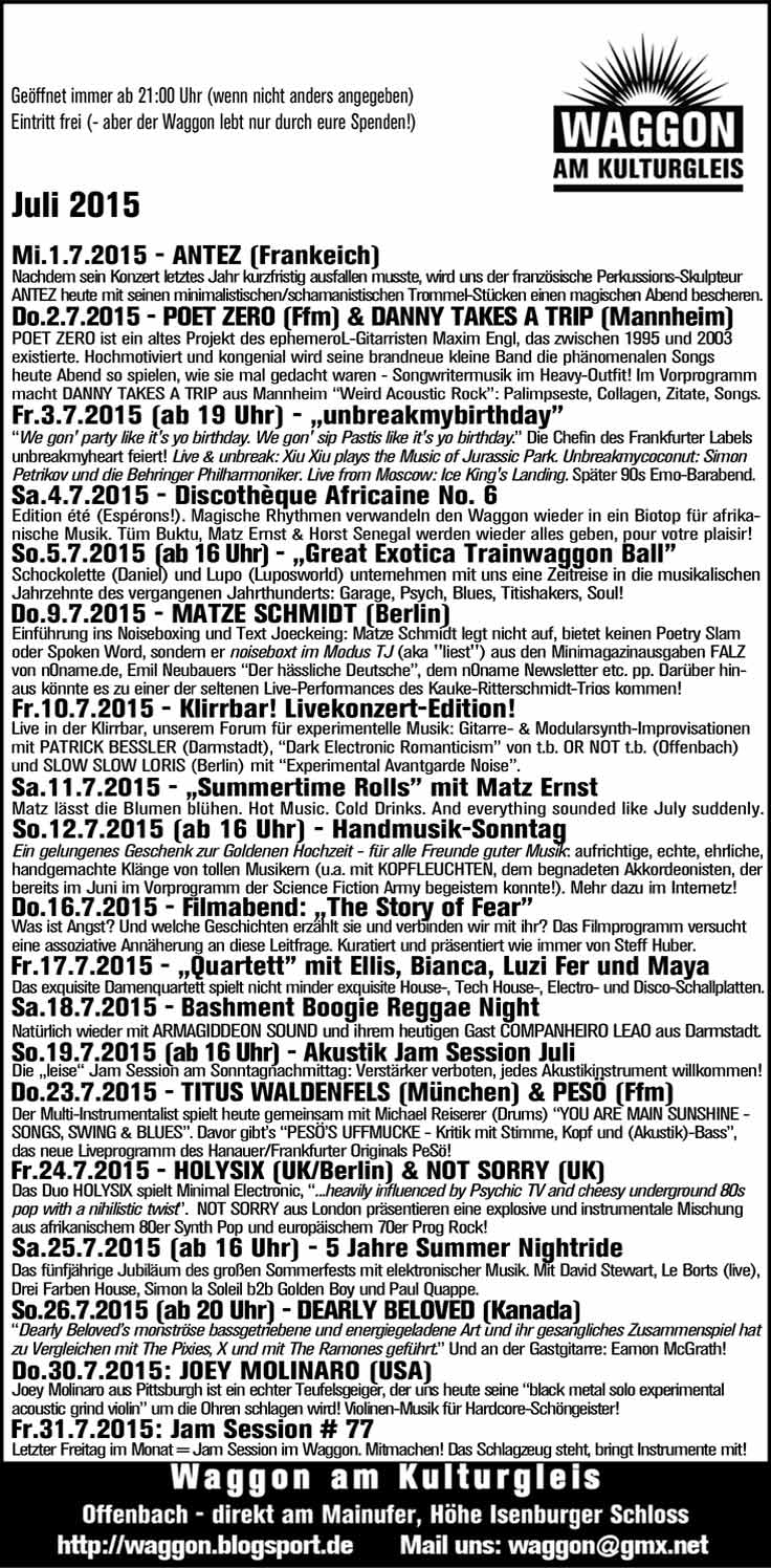 Hier kommt (– jedenfalls hoffentlich) wieder der Sommer! Der Juli im Waggon ist von aufregenden Livekonzerten nur so gespickt, nebenher gibt es auch noch obskure Lesungen, angsterregende Filme und jede Menge Lieblings-DJ-Abende! Könnt ihr ja alles auf unsrem Flyer lesen, der nun hiermit online veröffentlich ist… Schaut vorbei!