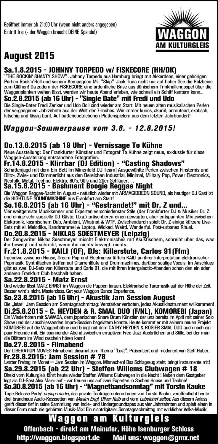 Sommerpause! Sommerpause! Wer seit Januar mehr oder weniger jedes Wochenende im Waggon steht, freut sich wirklich, wenn er es mal ein Wochenende nicht tun muß – insofern werdet ihr hoffentlich von Donnerstag 6.8. bis zum Sonntag 9.8. mal ohne uns auskommen, wir sind dann jedenfalls nicht da… Ab dem 13.8. läuft’s schon wieder ganz normal weiter, das Programm im Waggon – und mit „normal“ meinen wir natürlich wieder jede Menge unglaublicher Veranstaltungen und Konzerte, die ihr so nirgendwo anders geboten bekommt. Zum Beweis: der brandneue Augustflyer, trotz Sommerpause prall gefüllt wie immer. Sucht euch was raus und kommt vorbei – der Waggon und seine freundlichen Wirte freun sich auf euch!