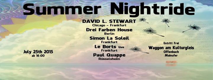 „Der Sommer ist da… der Himmel so klar… – Das Line up steht, es ist soweit ! Der Summer Nightride ist zum 5. mal zur Fahrt bereit. Musik ♫♪♪♫♪ Freude und Sonnenschein sollen an diesem Tag unsere Reisebegleiter sein. Wir wollen nicht nur Euch schöne Stunden bescheren, sondern der Tag gilt ebenso als gute Tat! Gemeinsam mit Eurer Hilfe und der Unterstützung der Freizeit Helden geht der gesamte Erlös (wie in den Vorjahren) wieder an die Waisenhausstiftung Frankfurt am Main. Neben der „Welcome Worscht“ haben wir in diesem Jahr noch ein paar weitere Specials in den Waggon gepackt. Tanzen, lachen und durch den Tag swingen, mit Spass und Leichtigkeit Kindern eine Freude bringen. Wir freuen uns auf eine groovige Sommernachtsfahrt!“ ★Das Summer Nightride Team★