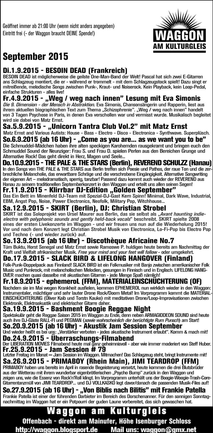 Tja… so langsam muss man sich darauf gefasst machen, daß der Sommer auch dieses Jahr leider nicht ewig währt. Deswegen besser nochmal in den Waggon, solange das Wetter noch so vorzüglich ist (Wir machen natürlich wieder bis Ende Dezember weiter, aber die Sonnenterasse wird wohl spätestens ab Mitte Oktober nicht mehr ganz so häufig genutzt werden…)! Um euch den Spätsommer so genußvoll wie möglich zu gestalten, haben wir auch den September wieder mit etlichen Programmhighlights geschmückt -aber seht doch einfach selbst! Wir freuen uns auf euren Besuch im Waggon Offenbach! Das Waggonteam