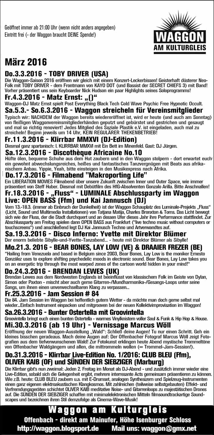 Schluß jetzt mit Winterpause – ab März geht es bei uns wieder los und ihr habt endlich wieder ’ne weitere Location, wo man am Wochenende mal hingehen könnte… Aber auch unter der Woche haben wir im März einiges für euch auf dem Programmzettel, denn vom 13.3. bis zum 18.3. gibt es während der LUMINALE 2016 ohnehin allabendlich die Licht/Multimedia-Installation „Fluss“ am & im Waggon zu bestaunen! Dazu Konzerte, Tanzveransstaltungen, Jam Sessions – und eine neue Waggonausstellung! Alles in allem genug Gründe für euch, im März mehr als einmal bei uns reinzuschauen…- und da freun wir uns drauf! Und hier ist er: der neue Monatsflyer! Viel Spaß!