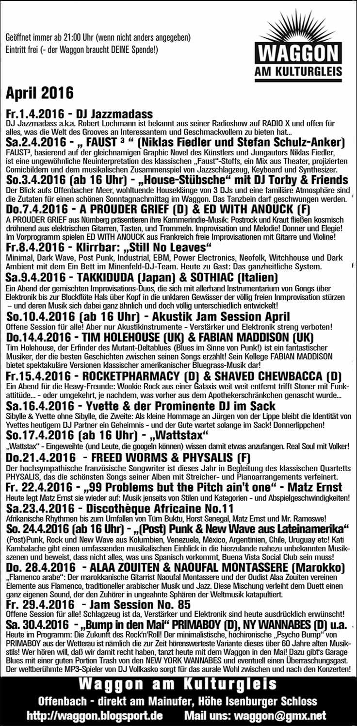 Marokkanische Weltmusik, afrikanische Tanzmusik, Postpunk und New Wave aus Lateinamerika, Wookie-Rock aus fernen Galaxien, experimentelle Live-Musik aus Japan …und jede Menge europäische Musiker aus Frankreich, Italien, England und der Wetterau – wir glauben, so international wie diesen Monat war das Waggonprogramm schon lange nicht mehr. Und das eigene Kulturerbe vernachlässigen wir natürlich auch nicht und bringen gleich richtig Faust auf die Waggon-Theaterbühne!! (Zwar nicht der von Goethe sondern der von Fiedler, aber möglicherweise ist das sogar besser!). Jetzt muß nur noch Mr. Frühling wieder auftauchen – und dann wird alles gut! Freilich nur, wenn ihr auch bei uns reinschaut – und das möglichst oft! Darauf freut sich: Das Waggon-Team!