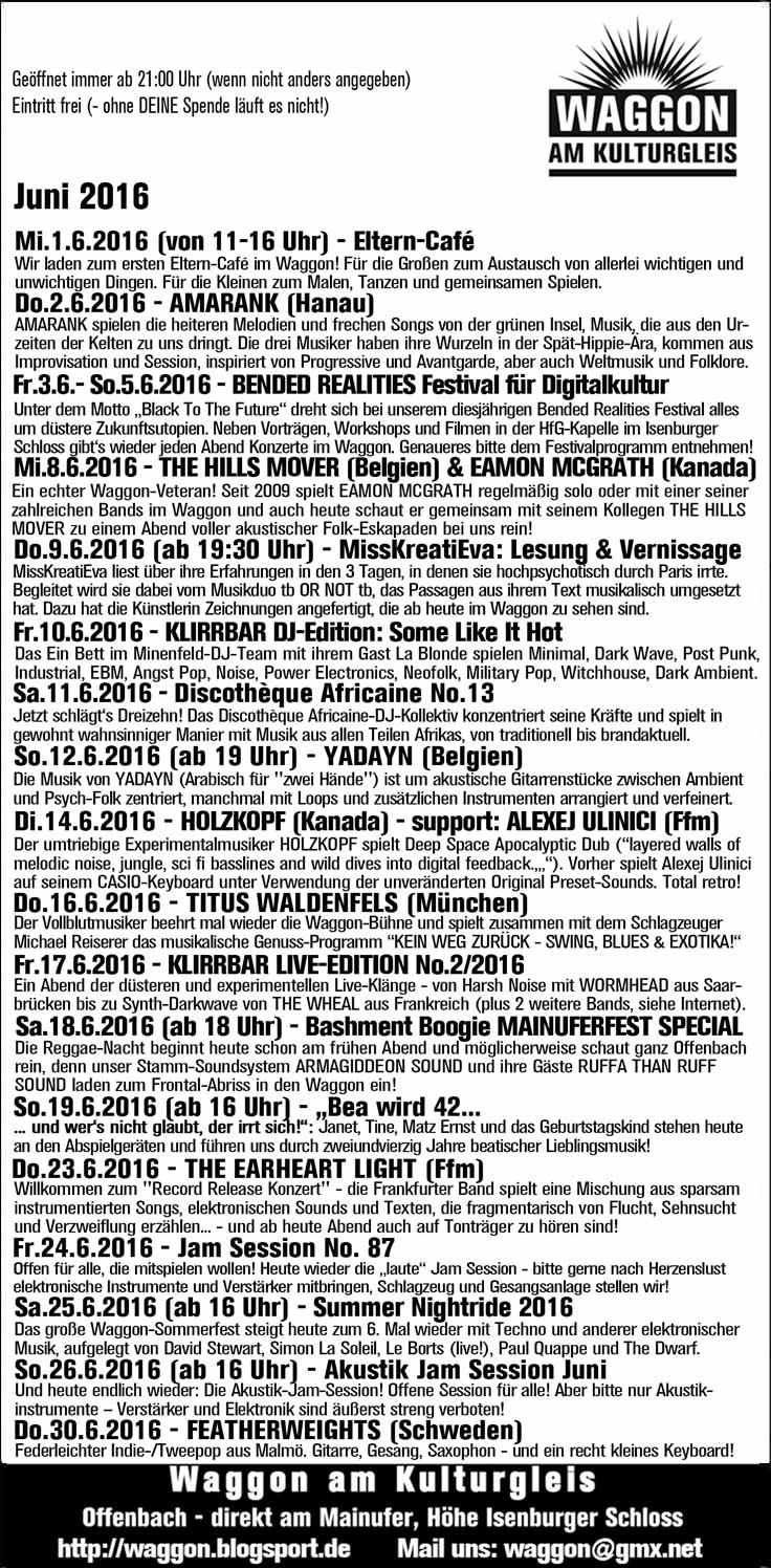 Im Juni überschlagen sich bei uns die Ereignisse, denn neben unserem alljährlichen Festival für Digitalkultur, dem BENDED REALITIES (das dieses Jahr am ersten Juni-Wochenende tagsüber in der HfG-Kapelle des Isenburger Schloss und abends im Waggon stattfindet, siehe hier für Details!), präsentieren wir auch noch eine neue Waggon-Ausstellung (inkl. Lesung) der Frankfurter Künstlerin MissKreatiEva am 9. Juni. Und am Wochenende vom 18./19. Juni feiert dann ganz Offenbach das große Mainuferfest und auch wir sind groß dabei! Neben Parties im Waggon ab dem frühen Abend haben wir auch an beiden Tagen wieder einen großen Info-Stand auf diesem Fest der Vereine – und an beiden Tagen wird die Waggon-Session-Band auf der Bühne auf der Kulturmeile zeigen, was sie so kann (nämlich alles!). Die restlichen Termine ( – u.a. 13 (!) weitere Konzerte, das ganztägige Technofest „Summer Nightride 2016“ und die üblichen Diskos und Jam-Sessions) sind dann sozusagen Routineveranstaltungen für den restlichen Juni!