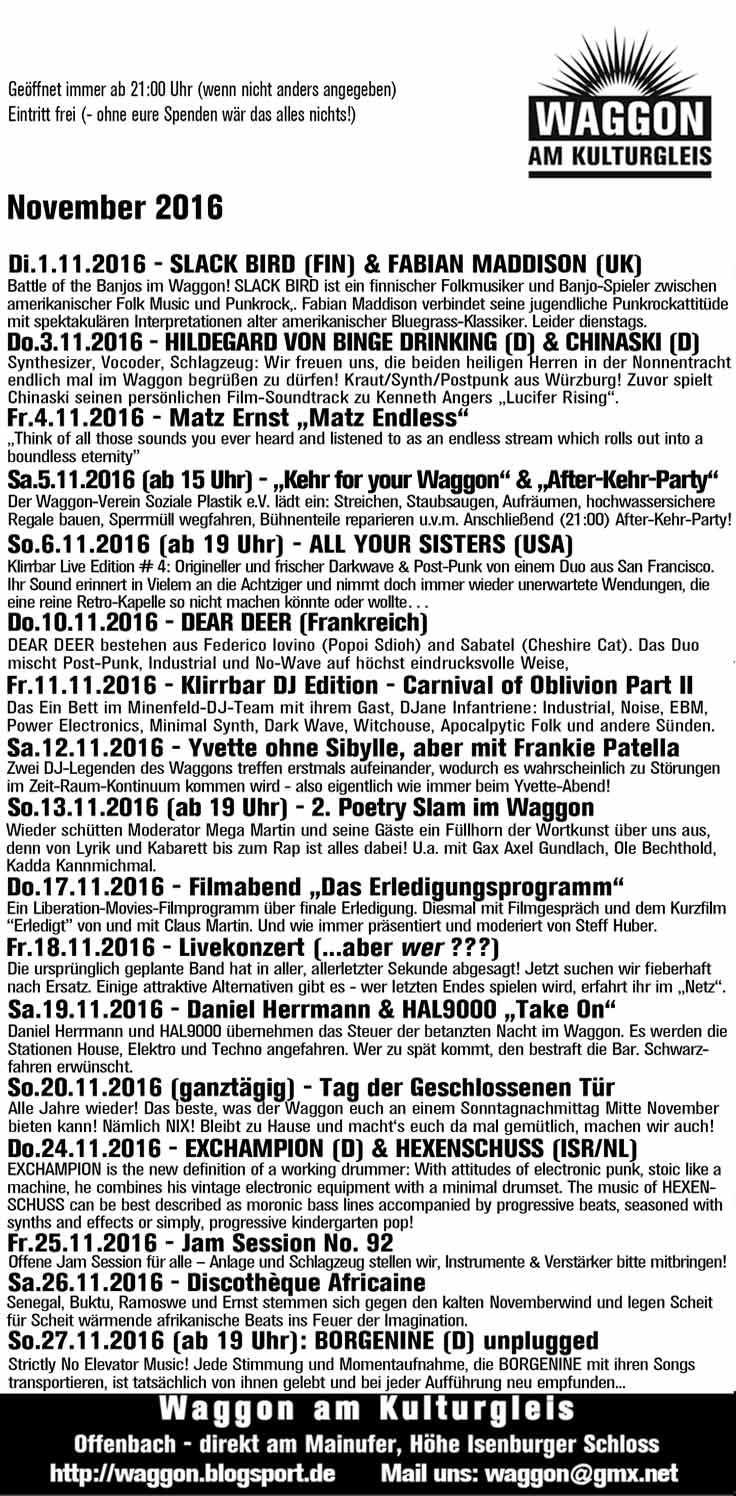 Wer meint, im Herbst ist es im Waggon ungemütlich und kalt, darf sich gerne weiter in diesem Irrglauben suhlen – muß sich dann aber auch nicht wundern, wenn er (respektive sie) die spannendsten Waggon-Veranstaltungen des Jahres verpasst – und zwar noch dazu in einem kuschelig warmen Waggon, weil beheizt! ….Just sayin‘!