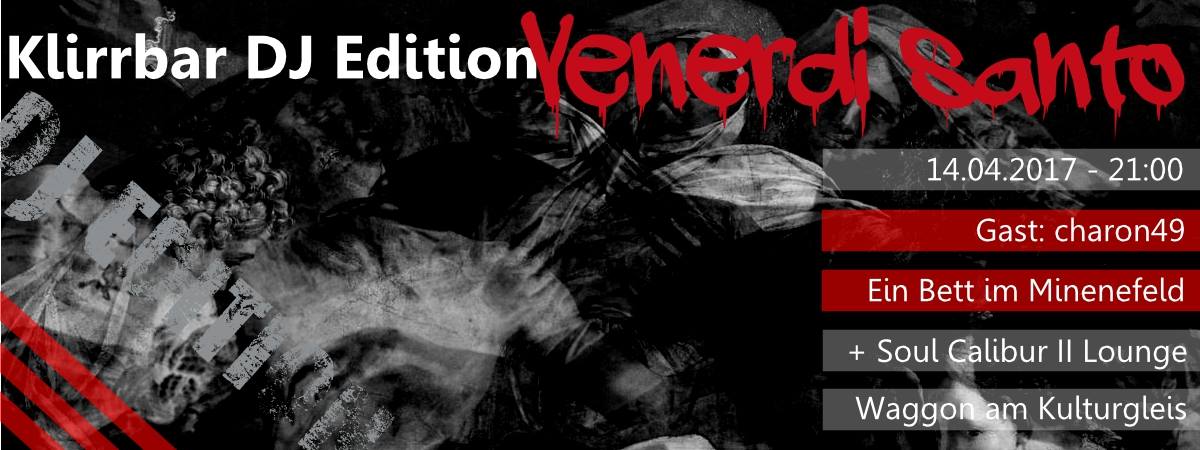 Adäquates Karfreitag-Programm voller ‚Klage‘, ‚Kummer‘, und ‚Trauer‘ und dem einen oder anderen verbotenen Tänzchen!  Denn das Ein Bett Im Minenfeld-DJ-Team und ihr DJ-Gast charon49 spielen wieder Dark Wave, Post Punk, Industrial, Power Electronics, EBM, Minimal, Apocalyptic Folk uvm… Als besondere Attraktion steht euch die  Soul Calibur II Lounge zur Verfügung (Tja – musste schon kommen, um zu erfahren, was das ist!).