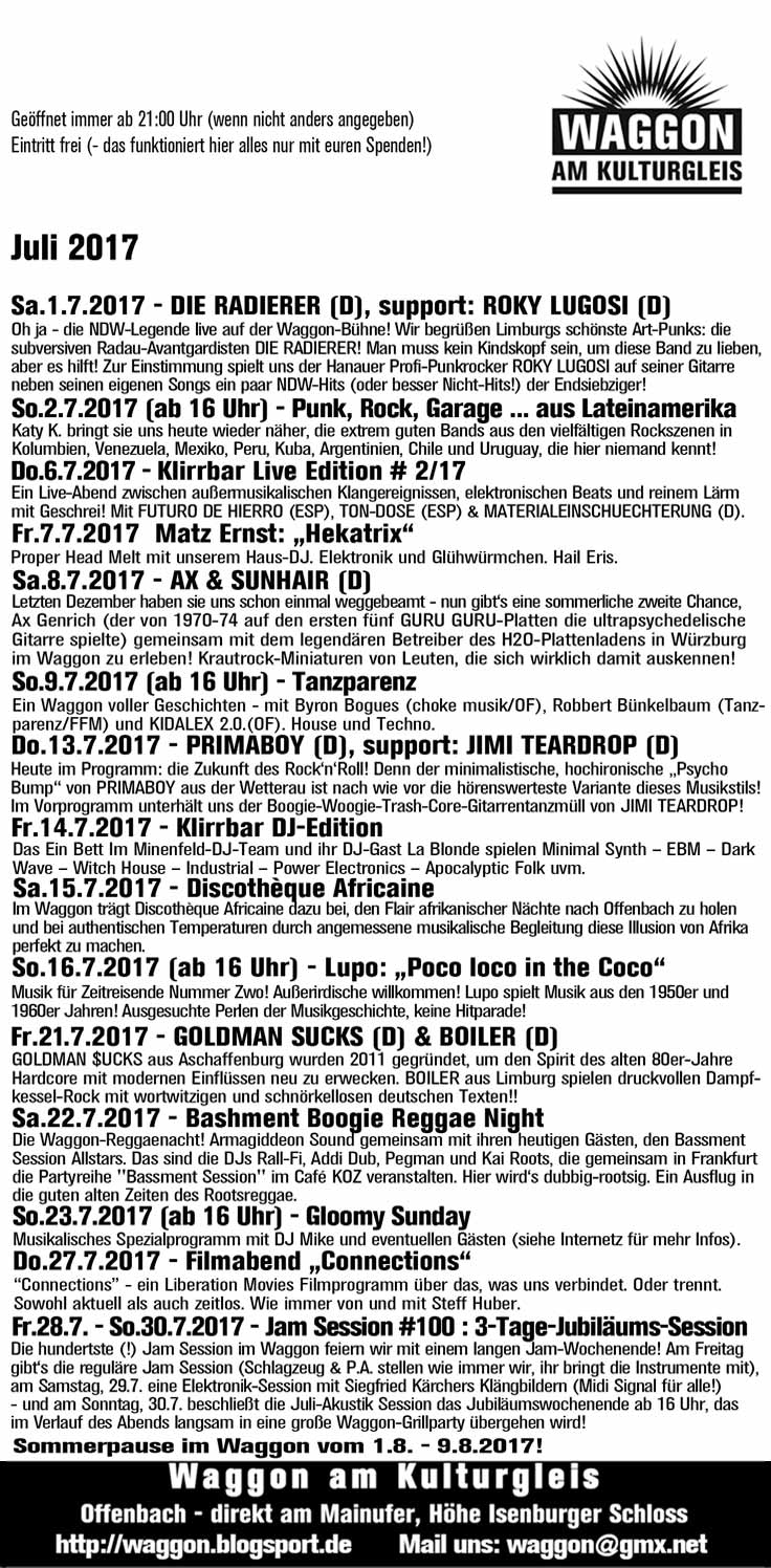 Na sowas – da haben wir ja die erste Jahreshälfte schon wieder rum gekriegt und befinden uns bereits auf der Zielgeraden zur nächsten Weihnachtsfeier… Vorher kommt allerdings noch etwas Sommer und Herbst… -und hier habt ihr das Waggon-Programm für Juli 2017. Gespickt mit großartigen Konzertereignissen mit legendären Bands & Musiker des deutschen Undergrounds der letzten 50 Jahre und einer ganzen Reihe beliebter DJ-Sets zwischen ekstatischem Tanz und musikalischer Weiterbildung (und im besten Fall beides!). Besonders erwähnen möchten wir das letzte Wochenende im Juli! Da veranstalten wir nämlich unsere hundertste (!) Jam-Session und die geht drei Tage lang, von laut und rockig (Freitag) über elektronisch (Samstag) bis hin zur gemütlichen Sonntagsnachmittag-Akustik-Jam Session!