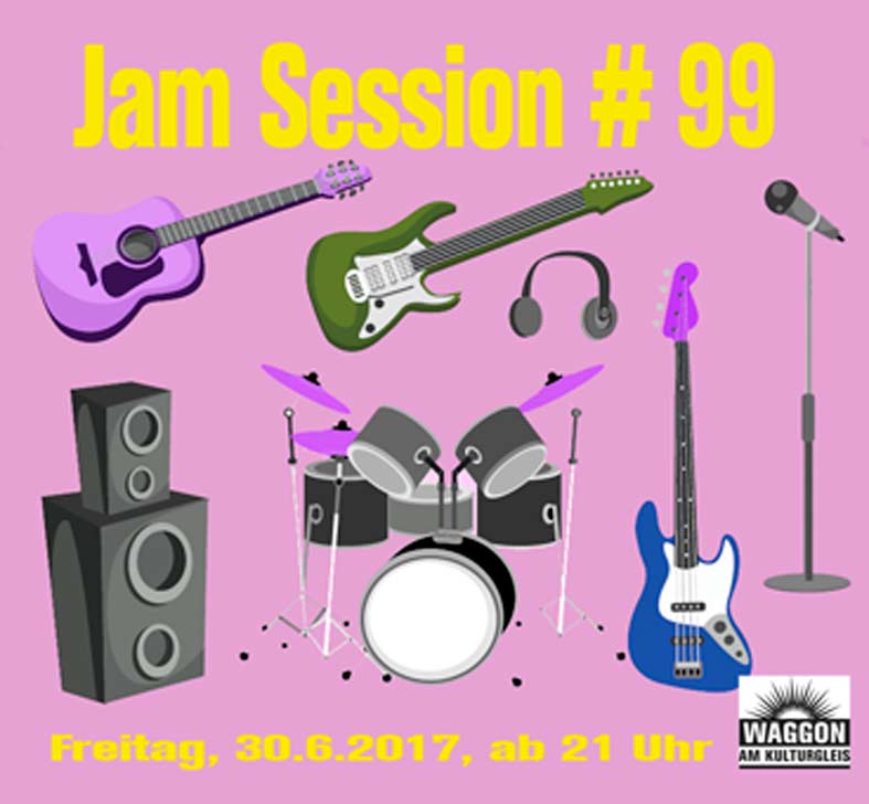Beitrags-Kategorie:ProgrammFreitag, 30. Juni 2017 (ab 21 Uhr): Jam Session #99Die neunundneuzigste Jam-Session im Waggon! Schlagzeug & P.A. stellen wie immer wir, Instrumente müsst ihr selbst mitbringen! Wie immer – so auch im Juni!Weitere Artikel ansehen Vorheriger BeitragDonnerstag, 29.6.2017 – JOHNNIE SELFISH & THE WORRIED MEN (I) Nächster Beitrag2017 im Waggon: Juli!Schreibe einen Kommentar Antworten abbrechenKommentierenGib deinen Namen oder Benutzernamen zum Kommentieren einGib deine E-Mail-Adresse zum Kommentieren einGib deine Website-URL ein (optional) Meinen Namen, meine E-Mail-Adresse und meine Website in diesem Browser für die nächste Kommentierung speichern. ΔDiese Website verwendet Akismet, um Spam zu reduzieren. Erfahre, wie deine Kommentardaten verarbeitet werden.