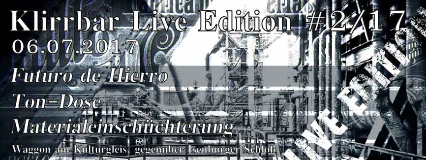 Viktor Lux Crux, der Kopf hinter den katalanischen Psychedelic/Industrial-Bands ORDRE ETERN und Q’AA (Langzeit-Waggon-Besucher erinnern sich an Auftritte beider Bands in den letzten 6 Jahren!) ist nunmehr mit seinem Post-Industrial Solo-Projekt FUTURO DE HEIRRO auf TOUR. TON-DOSE ist ein lustiges Projekt mit Klangerzeugern, die in Blechdosen eingebaut sind und ein herrliches Gerappel erzeugen. Vorher improvisiert MATERIALEINSCHUECHTERUNG, die Band von einem der Waggon-Wirte, einen atonal bis lyrischen Ritt durch wilde wundersame Soundlandschaften.