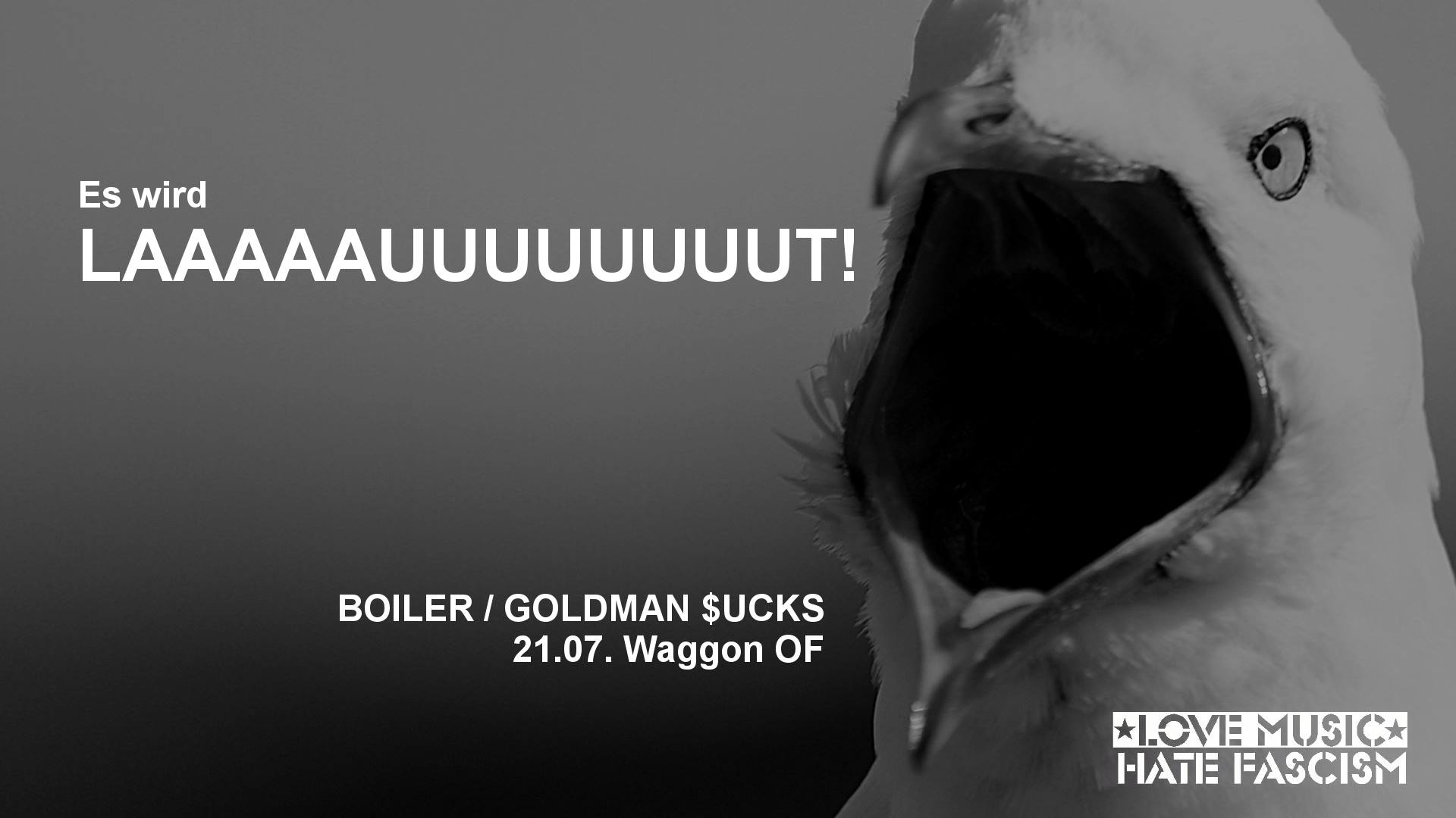 GOLDMAN $UCKS aus Aschaffenburg wurden 2011 gegründet, um den Spirit des alten 80er-Jahre Hardcore mit modernen Einflüssen neu zu erwecken. BOILER aus Limburg spielen druckvollen Dampfkessel-Rock mit wortwitzigen und schnörkellosen deutschen Texten!!