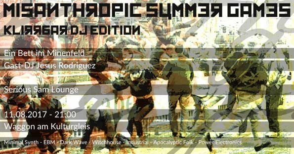 Misanthropic Summer Games – Austoben mit den DJs Ein Bett im Minenfeld und Jesús Rodriguez zu misanthropischen Klängen. Minimal Synth – EBM – Dark Wave – Witch House – Industrial – Apocalyptic Folk – Power Electronics! PLUS: Serious Sam Lounge
