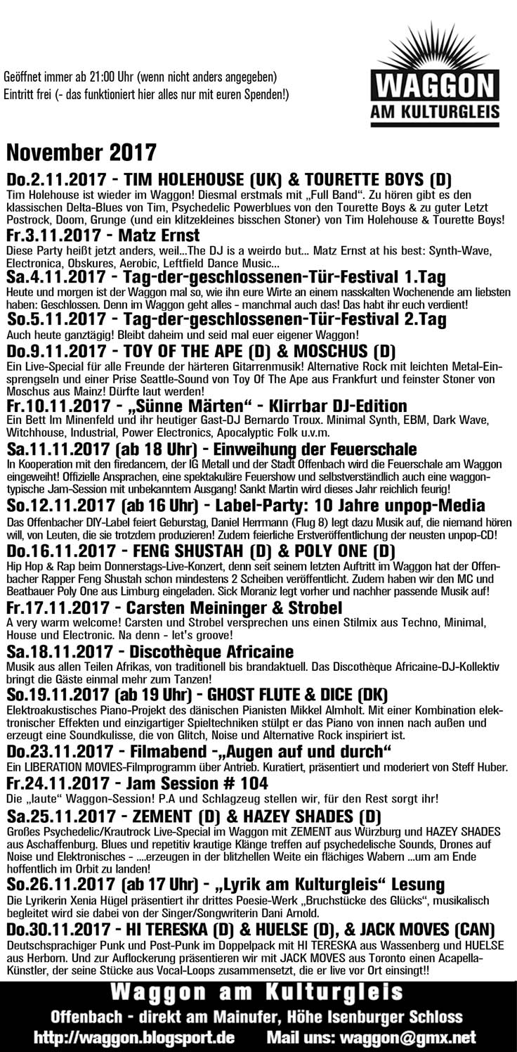 Jetzt isse wieder da – die Zeit wo es nicht selbstverständlich ist, daß man zum Waggon geht, weil man da so schön chillen kann. Im November besucht man den Wggon, weil man an einem ungewöhnlichen, zeitgemäßen (und vorallem: echten) Kulturprogramm interessiert ist, sei da auch Schnee oder Sturm (oder – bääh – beides!). Ihr wisst ja: es wird geheizt. Und können euch hiermit hoffentlich zu einem November-Waggon-Besuch (oder besser: mehreren) motivieren: Das Programm für den November 2017!