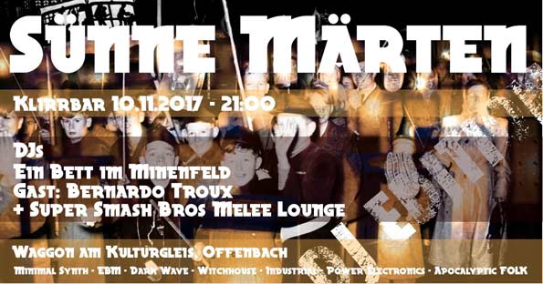 Ein Bett Im Minenfeld und ihr heutiger Gast-DJ Bernardo Troux. Minimal Synth, EBM, Dark Wave, Witchhouse, Industrial, Power Electronics, Apocalyptic Folk u.v.m… Plus Super Smash Bros Melee Lounge! Ab 21 Uhr!