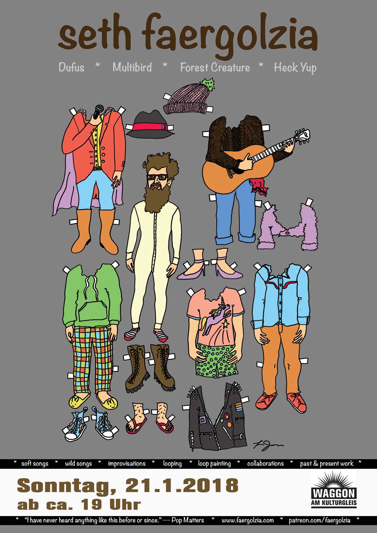 Dieses Mal mit einer anderen Art von Konzert! Er wird einen abwechslungsreichen Querschnitt durch seine 20-jährige Songwriter-Karriere mit Dufus / Multibird / Forest Creature / Heck Yup und 23 Psaegz spielen, aber uns auch seine neue Technik des „loop paintings“ näher bringe, bei der er mittels Looper und Pinsel simultan eine Klanglandschaft und ein Gemälde schaffen wird.