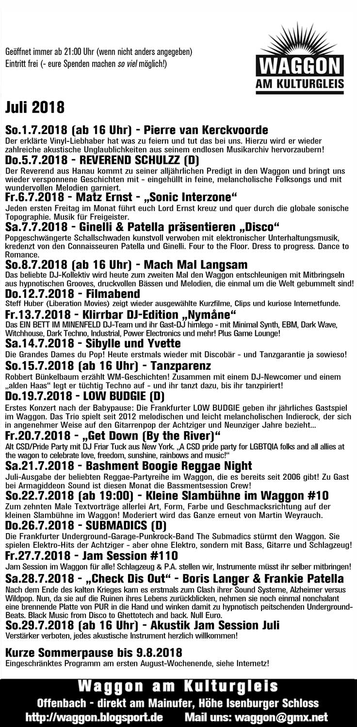 Huch, völlig unbemerkt vor lauter Sommer sind wir auch schon zur Hälfte mit dem Jahr 2018 im Waggon durch! Hier geht’s in den Juli, mit einem bunt durchmischten Unterhaltungskultur-Programm wie gehabt – nur noch geiler! Und keine Angst vor der für Anfang August angekündigten Sommerpause – während die Waggonwirte ordenlich urlauben, werden die treuen Aktivisten des Waggon-Vereins trotzdem die eine oder andere Sonderveranstaltung abziehen… Werdet ihr dann (im August-Flyer) ja schon sehen! Bis dahin – kommt zum Tanzen oder zum Chillen (oder beides, nacheinander), aber tut euch selbst diesen einen Gefallen: kommt in den Waggon! Und wir freun uns dann auch, gell? **Das Waggon-Team**