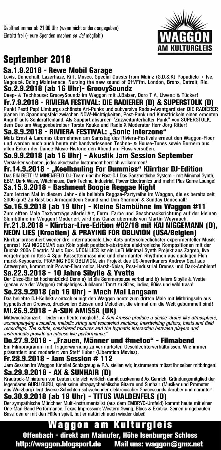 Besucht uns während des RIVIERA Festivals, seid bei der letzten Bashment Boogie (und dem wahrscheinlich letzten Mach Mal Langsam-Sonntag) des Jahres dabei, erlebt Minimal Synth/Postrock/Krautrock/Western Swing-Konzert der Sonderklasse, seht Filme und lauscht den Poeten beim Slam… (- der ja gar kein echter Slam ist!)… Wir präsentieren: den September 2018 im Waggon! *Das Waggon-Team*