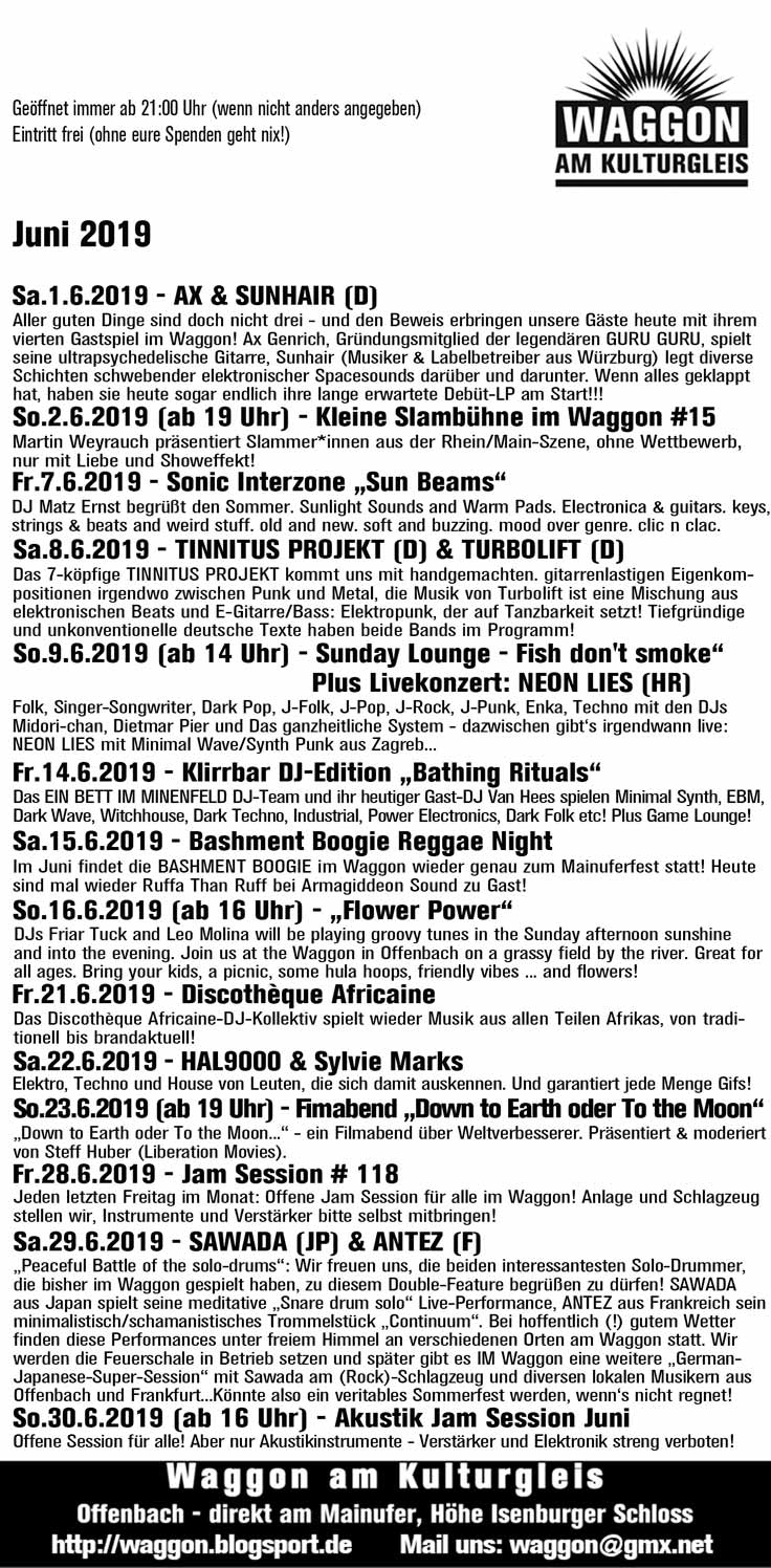 Beitrags-Kategorie:FlyerSO geht’s bei uns weiter: Der Juni 2019 im Waggon! Mit der gewohnten Mischung geht’s im Waggon hinein in den Sommer! Falls es einen gibt… Wir drücken uns allen die Daumen! Viel Spaß, *das WAGGON-Team* Weitere Artikel ansehen Vorheriger BeitragFreitag, 31.5.2019 – Jam Session #117 Nächster BeitragSamstag, 1.6.2019 – AX & SUNHAIR (D)Schreibe einen Kommentar Antworten abbrechenKommentierenGib deinen Namen oder Benutzernamen zum Kommentieren einGib deine E-Mail-Adresse zum Kommentieren einGib deine Website-URL ein (optional) Meinen Namen, meine E-Mail-Adresse und meine Website in diesem Browser für die nächste Kommentierung speichern. ΔDiese Website verwendet Akismet, um Spam zu reduzieren. Erfahre, wie deine Kommentardaten verarbeitet werden.