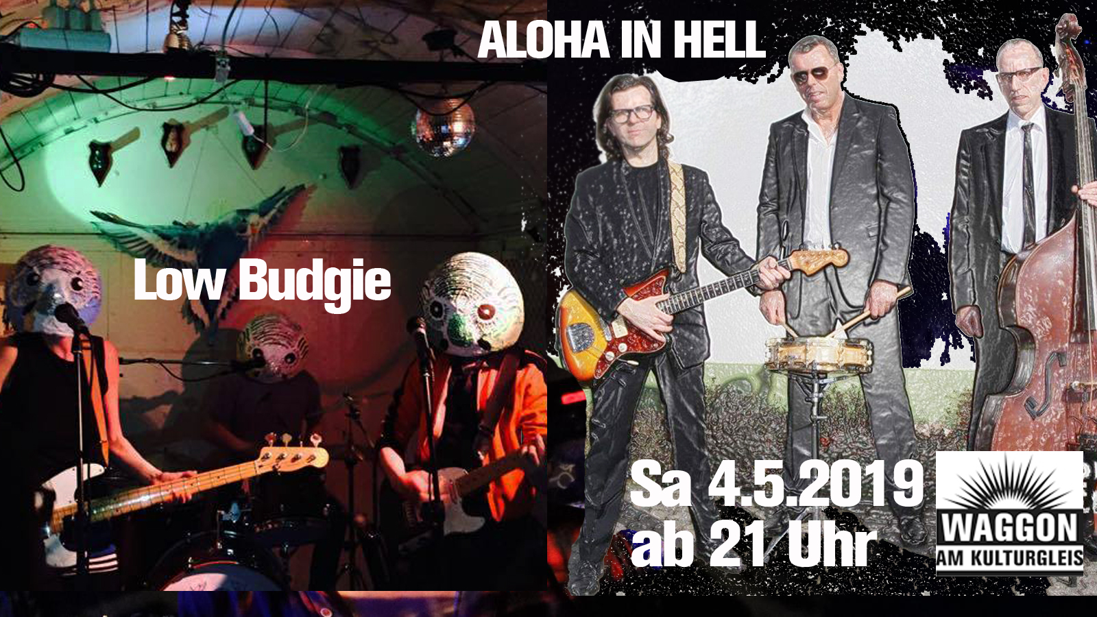 Nach mehrjähriger Pause und mit kosmetisch geändertem Bandnamen ist das legendäre Rock´n Roll Trio nun endlich wieder Live in Offenbach zu erleben! Bereits seit 1994 gibt das Trio ALOHA IN HELL Surf-Instrumentals, Rock´n Roll und Rockabilly Songs auf seine ganz besondere Weise zum Besten. Neben Eigenkompositionen werden in musikalischer Verbundenheit zur Subkultur der fünfziger und sechziger Jahre auch bekannte Songs der Ära interpretiert. To Hell with Aloha!