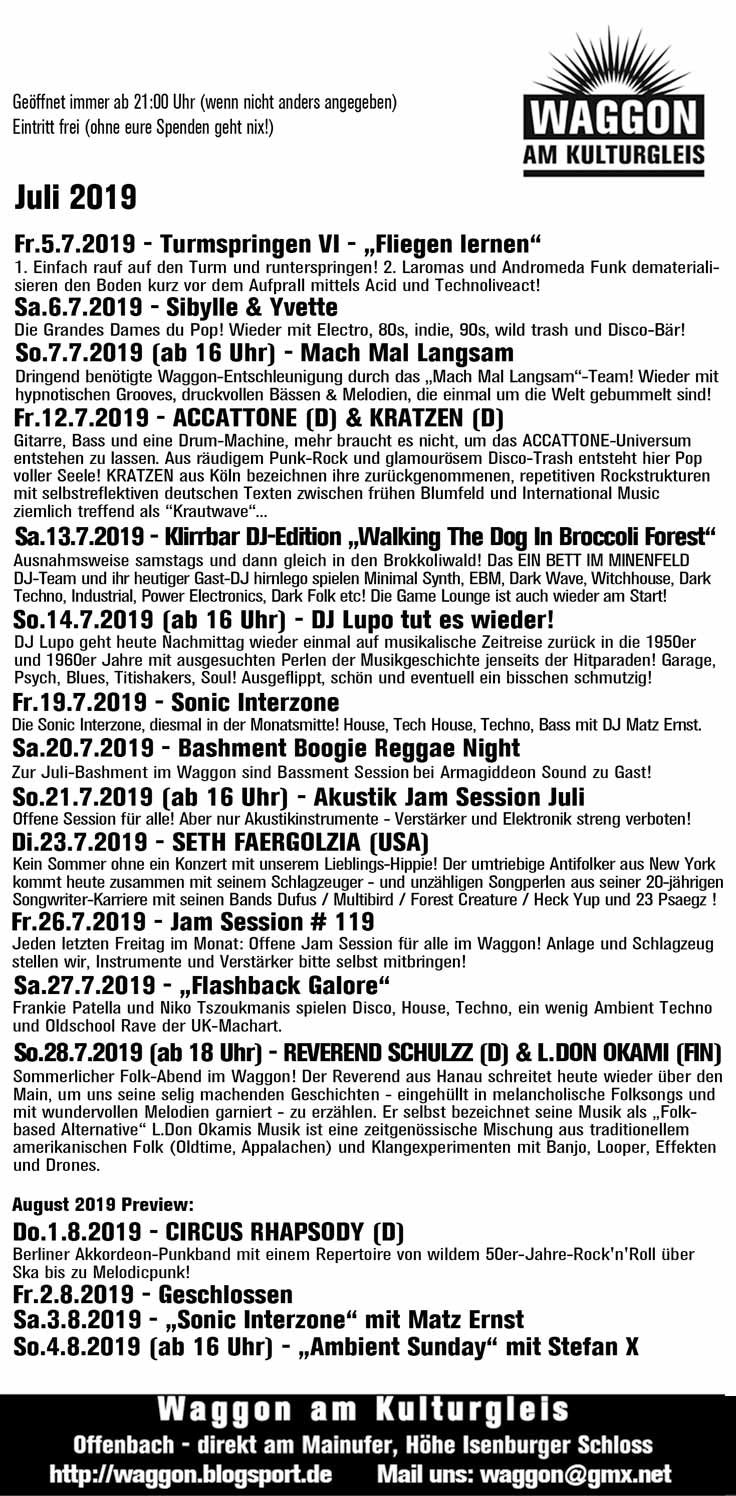 Nanu, was ist denn das? Da haben wir ja offenbar vergessen, rechtzeitig den Juli-Programmflyer zu posten! Wir entschuldigen uns bei allen, die ihn bereits vermisst haben und reichen ihn hiermit nach! Der Juli im Waggon – lest doch selbst, was alles geht. Es ist richtig Sommer – wer also die komplette Packung Waggon-Magie haben will, kommt jetzt, denn besser als im Moment wirds nicht mehr! (Obwohl es selbstverständlich immer gut ist im Waggon, zu welcher Jahreszeit auch immer, klar!). Kommt rum! *Das WAGGON-Team*