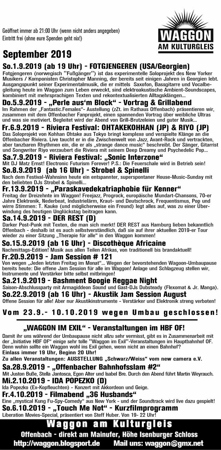 Vom 23.9 – 10.10.2019 ist der Waggon dieses Jahr geschlossen wegen Totalrenovierung und Neugestaltung des Innenraums! Vorher gibt es aber noch das Riviera-Festival und einige große Konzert- und DJ-Veranstaltungen (Z.B. DER REST live und die Bashment Boogie Reggae Abschlussparty am 21.9.!