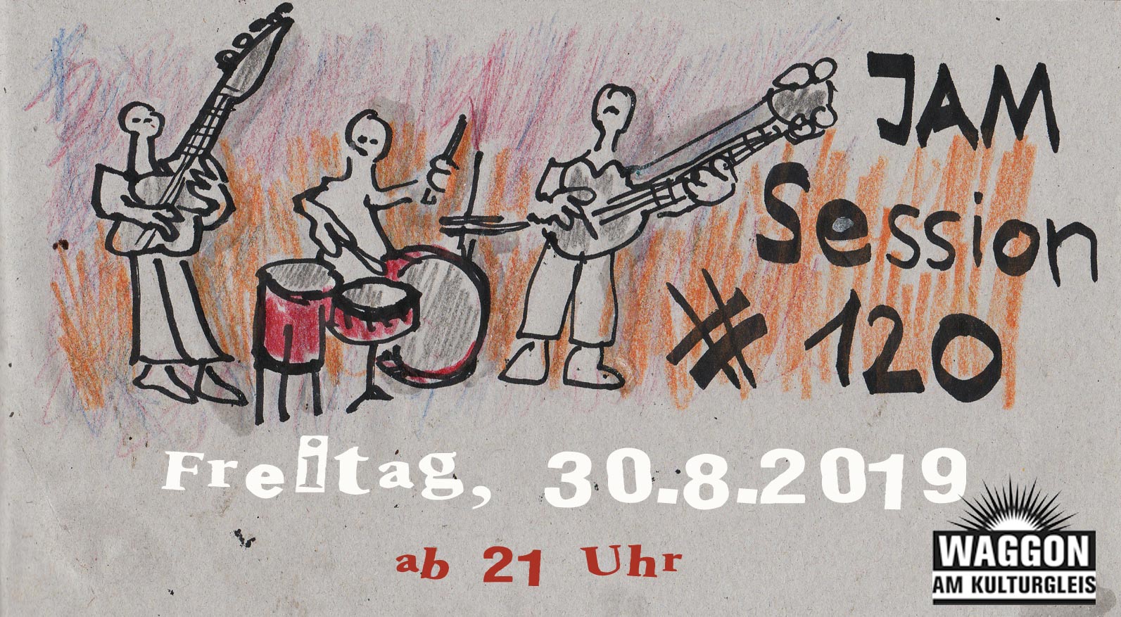 Beitrags-Kategorie:Jam Session / Programm / RegelmaessigFreitag, 30. August 2019 (ab 21 Uhr): Jam Session #120Jeden letzten Freitag im Monat: Offene Jam Session für alle im Waggon! Anlage und Schlagzeug stellen wir, Instrumente und Verstärker bitte selbst mitbringen!Weitere Artikel ansehen Vorheriger BeitragSonntag, 25.8.2019 – Lebe. Liebe. Lache. Nächster BeitragSamstag, 31.8.2019 – Sibylle & YvetteSchreibe einen Kommentar Antworten abbrechenKommentierenGib deinen Namen oder Benutzernamen zum Kommentieren einGib deine E-Mail-Adresse zum Kommentieren einGib deine Website-URL ein (optional) Meinen Namen, meine E-Mail-Adresse und meine Website in diesem Browser für die nächste Kommentierung speichern. ΔDiese Website verwendet Akismet, um Spam zu reduzieren. Erfahre, wie deine Kommentardaten verarbeitet werden.