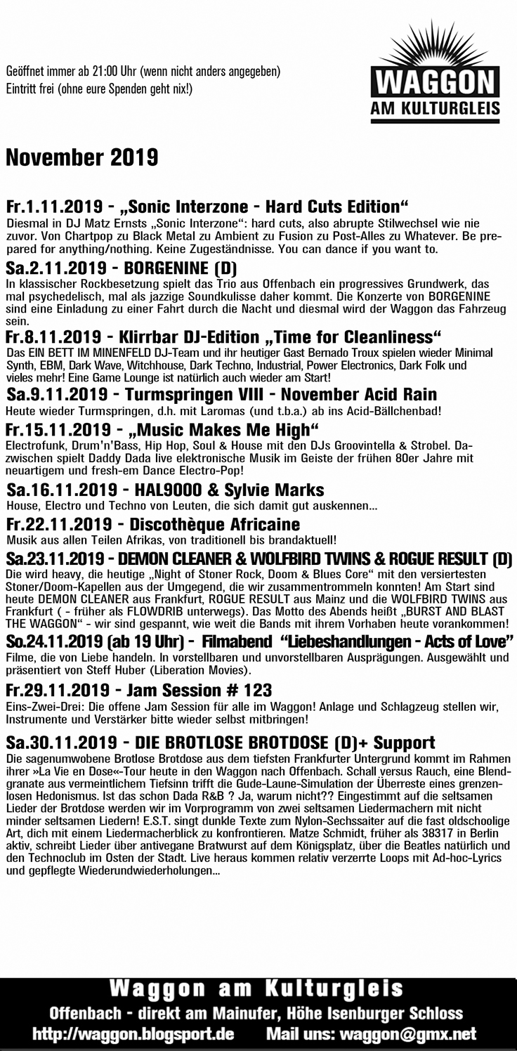 Nach einem turbulenten Herbst mit Festivals, Umbaupause und Exil-Programm versuchen wir es nun wieder mal mit ein bisschen Normalität im neuen Waggon! Willkommen zu unserem grundsoliden Waggonprogramm im November! Und kommt vorbei – ihr müsst euch unbedingt ansehen, wie’s hier jetzt aussieht! *Das Waggon-Team*