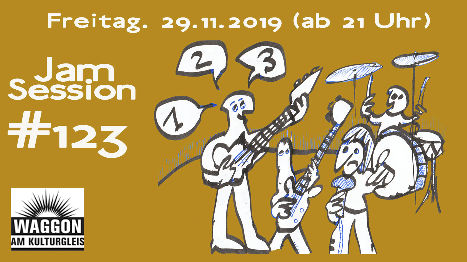 Beitrags-Kategorie:Jam Session / Programm / RegelmaessigFreitag, 29. Novenber 2019 (ab 21 Uhr): Jam Session # 123Eins-Zwei-Drei: Die offene Jam Session für alle im Waggon! Anlage und Schlagzeug stellen wir, Instrumente und Verstärker bitte wieder selbst mitbringen!Weitere Artikel ansehen Vorheriger BeitragSonntag, 24.11.2019 – Filmabend Nächster BeitragSamstag, 30.11.2019 – Die Brotlose BrotdoseSchreibe einen Kommentar Antworten abbrechenKommentierenGib deinen Namen oder Benutzernamen zum Kommentieren einGib deine E-Mail-Adresse zum Kommentieren einGib deine Website-URL ein (optional) Meinen Namen, meine E-Mail-Adresse und meine Website in diesem Browser für die nächste Kommentierung speichern. ΔDiese Website verwendet Akismet, um Spam zu reduzieren. Erfahre, wie deine Kommentardaten verarbeitet werden.