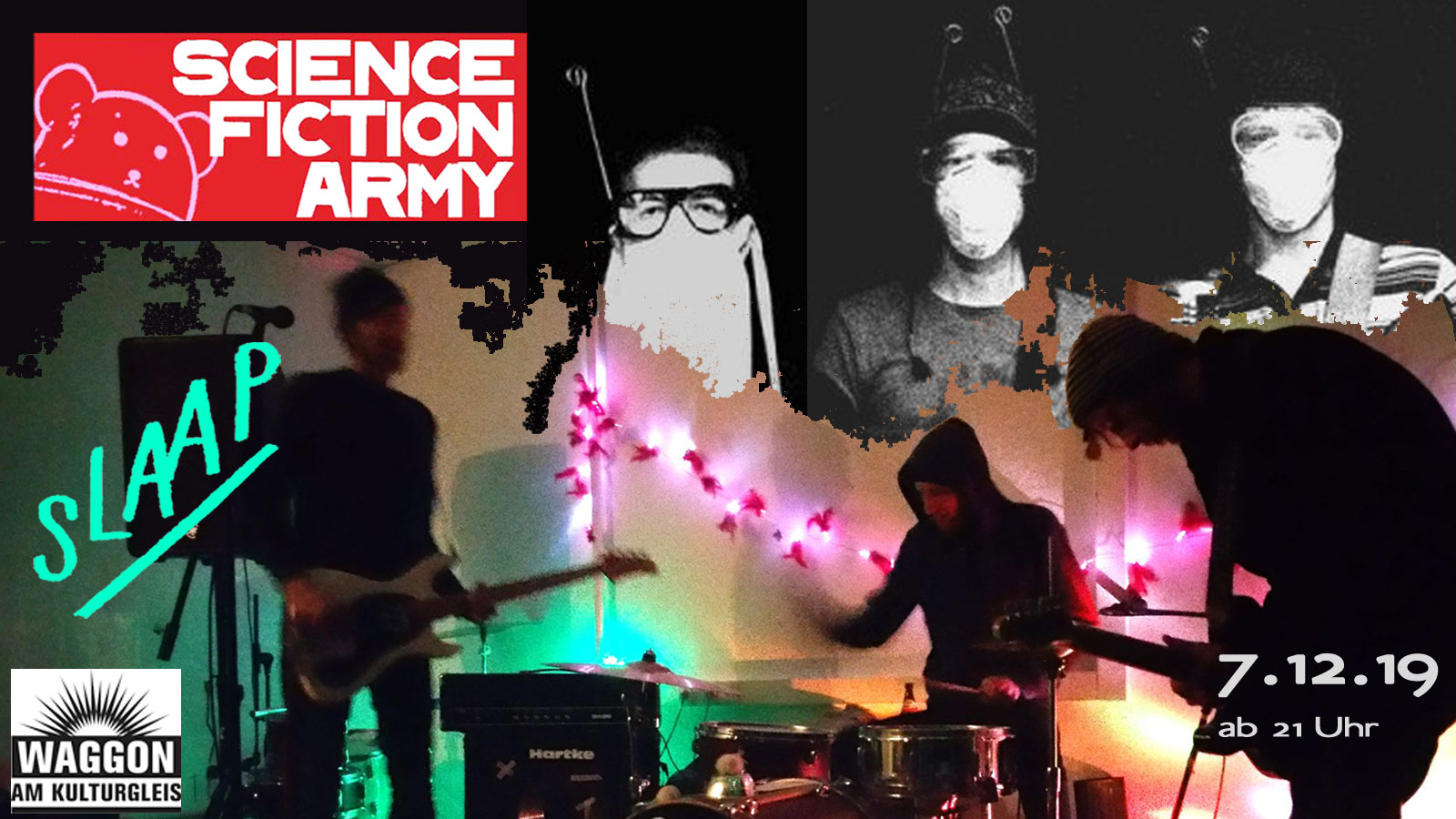 Die drei Astronauten der SCIENCE FICTION ARMY spielen ihr quasi-traditionelles alljährliches Waggonkonzert, durchbrechen dabei wieder einmal Raum und Zeit, dringen in die Weiten des Punk, Rock, Garage und Blues vor und entführen Euch zu einem neuen Weltraumabenteuer voll kurzweiliger Spannung! Munkelt ihre FB-Seite nicht sogar etwas von „neuer Schallplatte“ ?
