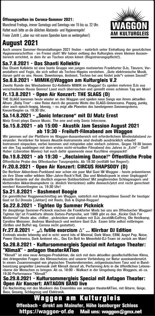 Beitrags-Kategorie:FlyerWeitere Artikel ansehen Vorheriger BeitragSonntag, 1.8.2021 – Jammern mit DJ Horst Senegal Nächster BeitragSamstag, 4.8.2021 – Das Shanti KollektivSchreibe einen Kommentar Antworten abbrechenKommentierenGib deinen Namen oder Benutzernamen zum Kommentieren einGib deine E-Mail-Adresse zum Kommentieren einGib deine Website-URL ein (optional) Meinen Namen, meine E-Mail-Adresse und meine Website in diesem Browser für die nächste Kommentierung speichern. ΔDiese Website verwendet Akismet, um Spam zu reduzieren. Erfahre, wie deine Kommentardaten verarbeitet werden.