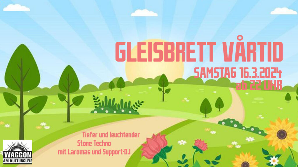 Beitrags-Kategorie:Gleisbrett / Programm / RegelmaessigImWaggonAb 22 Uhr!GLEISBRETT VÅRTIDIn i Ljuset! Frühlingszeit im Waggon!Tiefer und leuchtender Stone Techno mit Laromas und Support-DJ (t.b.a.).Ab 22 Uhr!Weitere Artikel ansehen Vorheriger BeitragFreitag, 15.3.2024 – Klirrbar Live Edition: Pink Noise Hanami Nächster BeitragSonntag, 17.3.2024 – Akustik Session März 2024Schreibe einen Kommentar Antworten abbrechenKommentierenGib deinen Namen oder Benutzernamen zum Kommentieren einGib deine E-Mail-Adresse zum Kommentieren einGib deine Website-URL ein (optional) Meinen Namen, meine E-Mail-Adresse und meine Website in diesem Browser für die nächste Kommentierung speichern. ΔDiese Website verwendet Akismet, um Spam zu reduzieren. Erfahre, wie deine Kommentardaten verarbeitet werden.