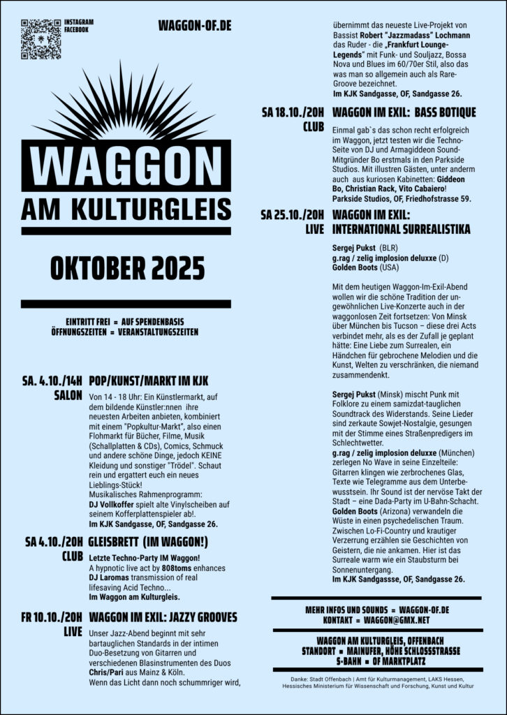 Im nächsten halben Jahr machen wir wieder (genau wie im letzten Winter) regelmässig spannende Konzertabende im KJK Sandgasse (Offenbach, Sandgasse 26) und spektakuläre Club-Spektakel in den Parkside Studios (Offenbach, Friedhofsstraße 59). Wann genau, das könnt ihr unserem Schienen-Ersatz-Kultur-Plakat entnehmen . Eröffnen werden wir die Exil-Saison im KJK mit unserem gro0en POP/KUNST/MARKT am Samstag, 4.10 von 14-18 Uhr, auf dem zahlreiche bildende Künstler:nnen ihre neuesten Arbeiten anbieten – und das in Kombination mit einem „Popkultur“-Markt für Bücher, Filme, Musik (Schallplatten & CDs), Comics, Schmuck und andere schöne Dinge! Und bevor wir die Waggontür endgültig abschließen, schieben wir sie kommenenden Samstagabend noch ein allerletztes Mal für ein zünftiges Gleisbrett auf! Die wirklich allerletzte Techno-Party im Waggon am Kulturgleis! Die nächsten Monate werden sehr spanennd und neu für uns – wir freuen uns sehr, wenn ihr uns in unseren Exilen besuchen kommt! *Das Waggon Team*