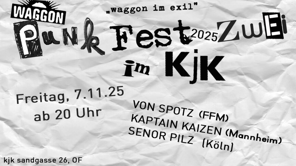 - Freitag, 7.11.2025 – WAGGON PUNK FEST 2025 ZWEI im KJK SandgasseOktober 30, 2025 - Ab 20 Uhr! - WAGGON PUNKFEST 2025 ZWEI- Ein zweites Waggon-Punkfest 2025 im Exil! - Anfang Februar hatten wir das Jahr 2025 mit einem rauschenden Punkfest im KJK Sandgasse eingeleitet, das so geil war, daß wir das Jahr mit genau so einem auch wieder verabschieden wollen!