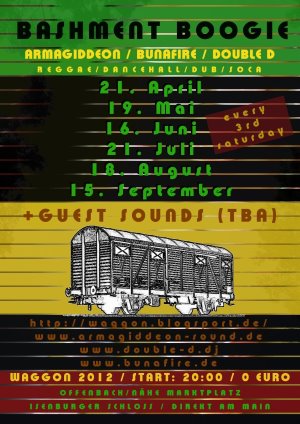 Bashment Boogie ist eine gemeinschaftlich ins Leben gerufene Party von Double D (OF), bunAfireSoundsystem (HU) und Armagiddeon Sound (OF), die in den Sommermonaten April bis September monatlich im und um den Waggon am Offenbacher Mainufer statfindet.Samstag, 13.8.2011 – Bashment Boogie Reggae Night