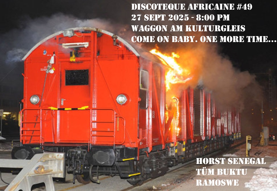 - Samstag, 15.3.2025 – Discothèque Africaine No. 49 - Ab 20 Uhr - Musik von Kairo bis Kapstadt, von früher bis Zukunft. - Der Waggon rumpelt, scheppert, gleitet, beschleunigt und bremst wieder Mal durch den afrikanischen Kontinent.